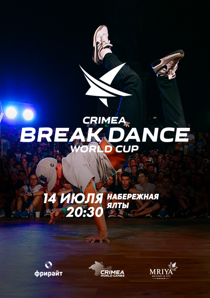 При поддержке Министерства курортов и туризма РК в Ялте 14 июля пройдет чемпионат Мира по брейкингу «Crimea Break Dance World Cup». Впервые на танцевальной арене встретятся сильнейшие танцоры из Японии, США, Канады, Нидерландов, России, Украины, Казахстана, Беларуси, Португалии. Чемпионат пройдёт на сцене, сконструированной̆ прямо над морем, в самом сердце Ялтинской набережной. Это состязание сможет увидеть тысячи туристов, прогуливающихся по набережной. 16 российских и зарубежных танцоров будут демонстрировать своё мастерство в битвах один на один. Отдельного внимания стоит количество танцоров, которые обеспечат группу поддержки. В дни проведения чемпионата в Ялте будет находиться более 2 тысяч танцоров, приехавших на мастер-классы и отдых в рамках ежегодного танцевального фестиваля Yalta Summer Jam. С танцевального чемпионата стартует международная серия соревнований в зрелищных дисциплинах «Crimea World Games», организаторами которых являются Общественная организация «Фрирайт» и курортный комплекс «Mriya Resort & Spa».